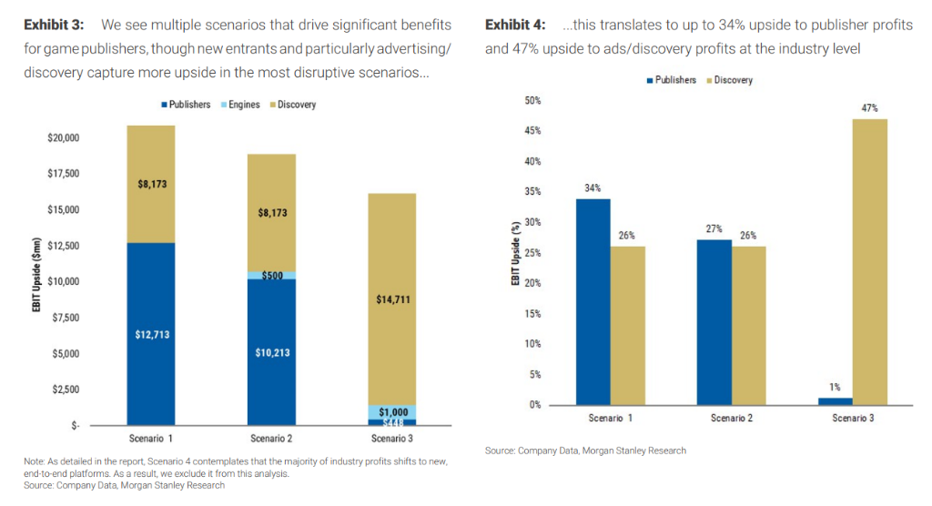 在最温和的情景一(现任者适应)中,传统发行商可获约130亿美元增量利润(EBIT提升34%),广告/发现平台获益约82亿美元(EBIT提升26%)。