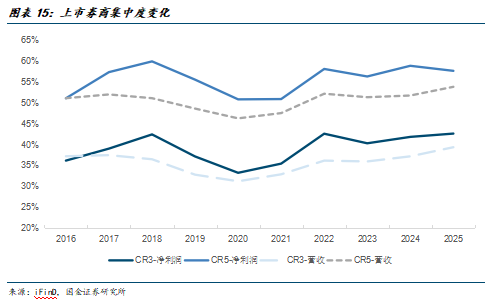 2025年头部前三、前五、前十名券商合计营收增速分别达到+39%/+36%/+33%,表现优于行业整体增速(31%),归母净利润增速分别达到+48%/+43%/+45%。从集中度来看,2025年营业收入CR3、CR5分别达到39%、54%,同比分别+2.2pct、+2.1pct;上市券商归母净利润CR3、CR5分别达到43%、58%,同比分别+0.8pct、-1.2pct。