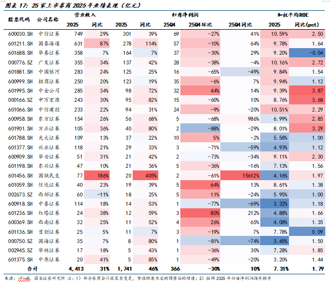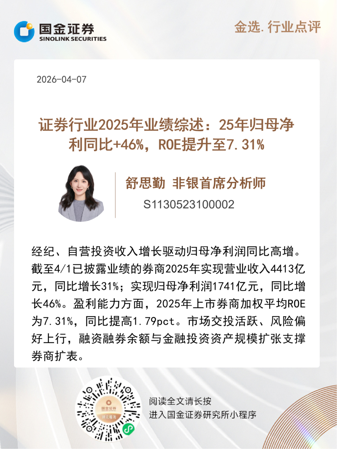 《证券行业2025年业绩综述:25年归母净利同比+46%,ROE提升至7.31%》 ]article_adlist-->+