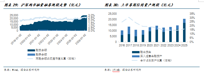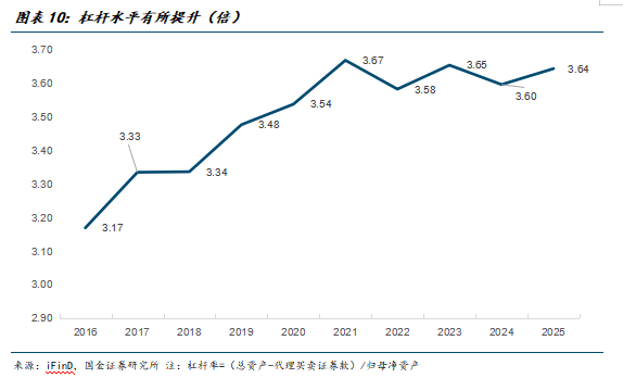 市场交投活跃、风险偏好上行,融资融券余额与金融投资资产规模扩张支撑券商扩表。截至2025年末,上市券商归母净资产合计达到2.25万亿元,较2024年末提升17%。杠杆水平方面,截至2025年末,上市券商平均杠杆倍数为3.64倍(剔除客户资金口径),较2024年末上升0.05倍。