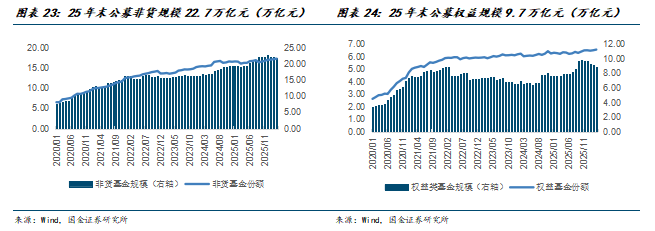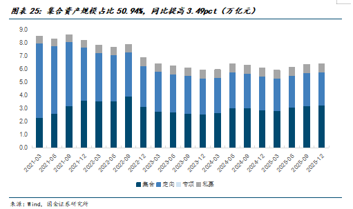 截至2025年12月末,公募非货规模22.7万亿元,同比增长2%;权益类公募9.7万亿元,同比微降0.3%。2025年末,证券资管规模为6.4万亿元,同比增长6%。集合资产规模占比50.94%,同比提高3.49pct。