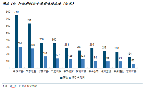 个股盈利表现上,中信证券归母净利润位居行业第1,国泰海通、华泰证券、广发证券、中国银河位居第2-5位。