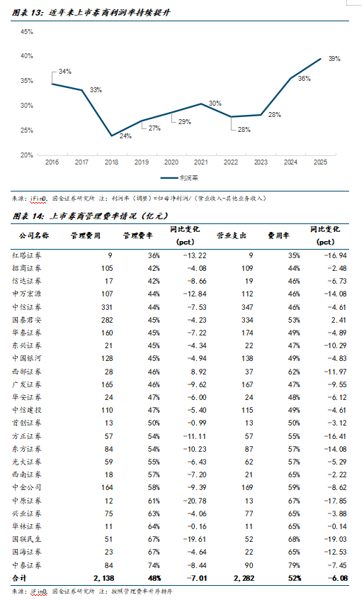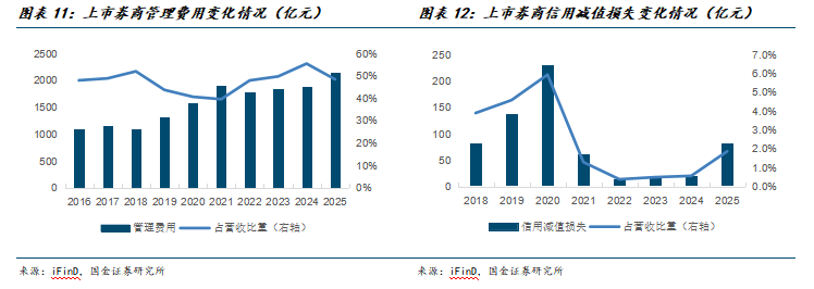 费用方面,2025年上市券商管理费用合计达到2138亿元,同比+14%,占营收比重同比-7pct至48%。分个股来看,券商管理费率均有所下降,红塔证券、招商证券、信达证券管理费用率最低,分别为36%/42%/42%,同比-13.22pct/-4.08pct/-8.66pct;中泰证券、国海证券、国联民生管理费用率最高,分别为74%/67%/67%,同比-8.44pct/-4.64pct/-19.61pct。信用减值损失有所提高,2025年信用减值损失合计达82亿元,同比增长335%,占营收比重提升1.3pct至1.9%。券商降本增效带来行业利润率提升,行业利润率同比提升3pct至2025年的39%(2023年以前较低主要是由于会计准则不同)。