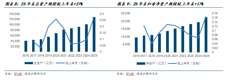 国泰海通:2025年实现营收631.07亿元,同比增长87.40%;实现归母净利润278.09亿元,同比增长113.52%;加权平均ROE为9.78%,同比增加1.64pct。25年公司实现经纪业务净收入151亿元,同比增长93%。25年公司境内股基交易份额8.56%,较上年末+0.03pct,君弘APP及通财APP平均月活1570万户(去重口径),同比增长近12%,均排名行业第一。25年公司实现投资净收入254亿元,同比增长72%,主要是交易性金融工具投资收益增加,吸收合并海通证券后交易性金融资产规模环比增长3%、较上年末增长69%。
