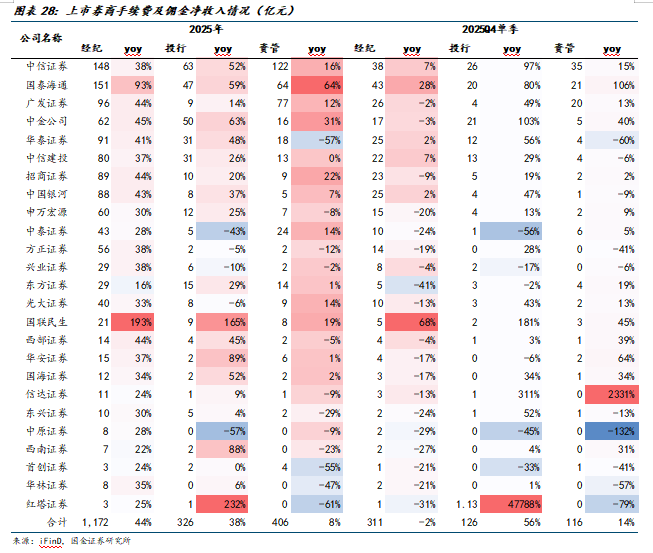得益于市场交投活跃度持续提升,2025年上市券商经纪业务净收入合计1172亿元,同比大幅增长44%。代销金融产品业务方面,上市券商合计111亿元,同比增长51%。25H2末,券商非货保有规模市占率较25H1末提1.72pct至22.2%。个股来看,经纪业务收入排名前三的公司为国泰海通、中信证券、广发证券,分别实现经纪业务净收入151、148、96亿元;收入增速排名前三的公司为国联民生、国泰海通、中金公司,增速分别为+193%/+93%/+45%。