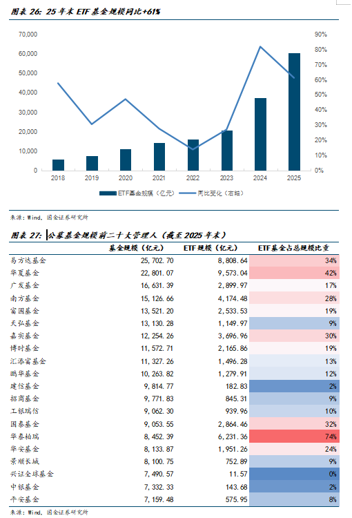 ETF市场持续高增,头部基金公司优势巩固。Wind数据显示,截至2025年末,市场存续ETF基金总数已达1402只,整体规模突破6万亿元,较2024年末大幅增长61%。从竞争格局看,华夏基金与易方达基金稳居行业第一梯队,管理规模分别高达9573亿元和8809亿元,华泰柏瑞基金位居第三,管理规模为6231亿元,ETF管理规模占总规模比例74%,为全行业最高。