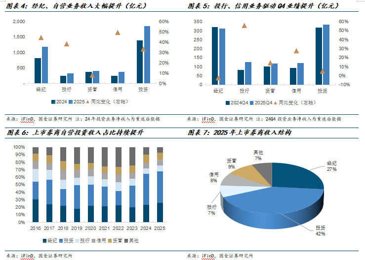 单季度来看,上市券商经纪、投行、信用收入大幅提升。2025Q4单季上市券商经纪、投行、资管、利息、投资业务净收入同比增速分别为-2%/+56%/+14%/+28%/+5%。从业务结构来看,2025Q4经纪、投行、资管、利息、投资业务净收入占营业总收入的比重分别为29%/12%/11%/11%/31%,同比变化-2.3/+3.8/+0.8/+1.9/-0.1pct。