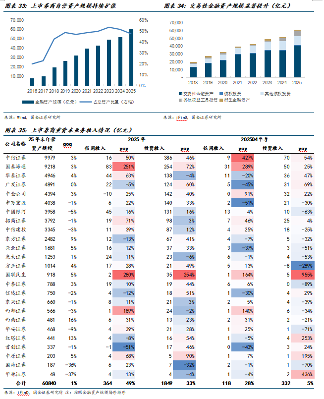2025年上市券商投资净收入合计1849亿元,同比增长33%。收入排名前三的公司为中信证券、国泰海通、中金公司,分别实现投资净收入386、254、142亿元。收入增速排名前三的公司为国联民生、中原证券、国泰海通,同比增速分别为+254%/+90%/+72%。