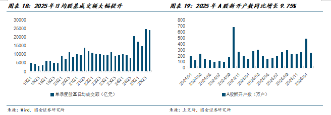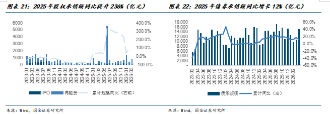2025年投行业务增长强劲,科创板改革、重大资产重组管理办法推动A股股权融资、并购市场复苏,A股市场股权承销规模(Wind,上市日口径)在低基数下同比提升236%,债权承销规模同比增长13%,港股市场IPO募资额同比增长224.24%至2858亿港元。