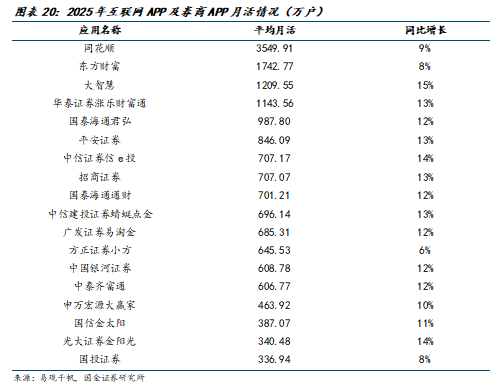 2025年全市场日均股基成交额同比增长70%至2.05万亿元。易观千帆数据显示,2025年全年证券类APP月活跃用户数突破1.68亿,同比增长超10%,并在12月以1.75亿的规模创下年度新高。华泰证券涨乐财富通以1143.56万人保持领先,是唯一一家月活超千万的传统券商APP;兴业证券优理宝月活提升最快,25年11月月活较1月月活相比,增速高达68%。